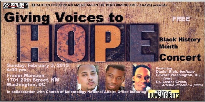 CAAPA (the Coalition for African Americans in the Performing Arts) will be partnering with Youth for Human Rights DC for a Black History Month celebration of human rights and freedom. Washington National Opera performers accompanied by Dr. Lester Green will take the stage to give voice to the hopeless through the beauty of music.