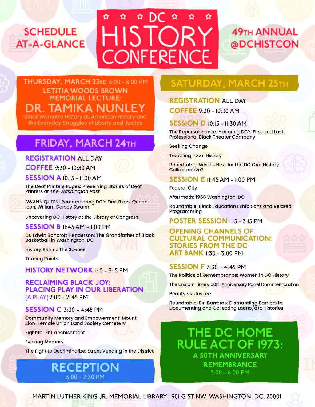 DC Black History Happens Now by DC Black HistoryMarch 12, 202312:40 pmApril 2, 2023 DC History Conference thursday, March 23 – Saturday, march 25 free & open to the public Due to high registration numbers, we are no longer accepting online registrations. You can register in person when you arrive at the Martin Luther King Jr. Memorial Library. Registration will resume when the library doors open at 9:30 am on Friday morning. Related