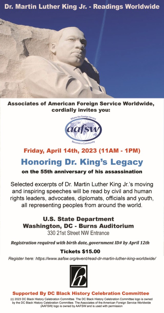 DC Black History Happens Now by DC Black HistoryApr 2, 20233:23 pm Read More Dr. martin luther king jr. – readings worldwide Friday, April 14th | 11:00 AM – 1:00 PM