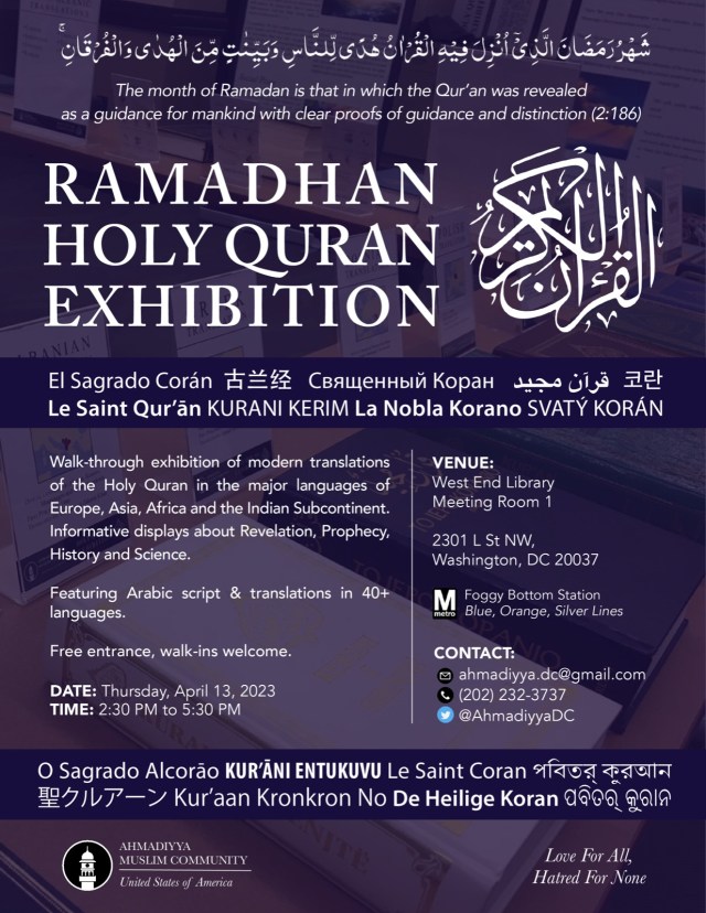 thursday, april 13, | 2:30 – 5:30 PM Walk-through exhibition of the Holy Quran in the major languages of Europe, Asia, Africa, and the Indian Subcontinent. Informative displays about Revelation, Prophecy, History, and Science. west […]