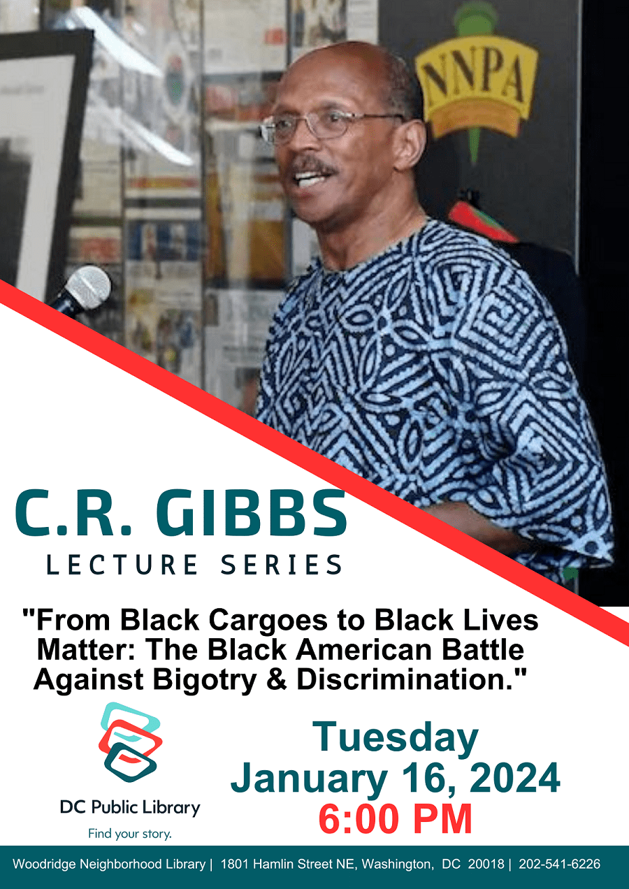 DC Black History Happens Now, Lectures, Talks & Panels, Public Library by DC Black HistoryJanuary 9, 20242:47 pmJanuary 15, 2024 c. r. gibbs lECTURE sERIES From Black Cargoes To Black Lives Matter: The Black American Battle Against Bigotry & Discrimination Tuesday, January 16th, 2024: 6PM Related