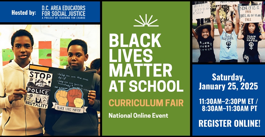 On Saturday, January 25, 2025, Teaching for Change’s D.C. Area Educators for Social Justice will host an online curriculum fair featuring a keynote speaker and workshops set to uplift the 13 guiding principles that focus on improving the school experience for Black students.