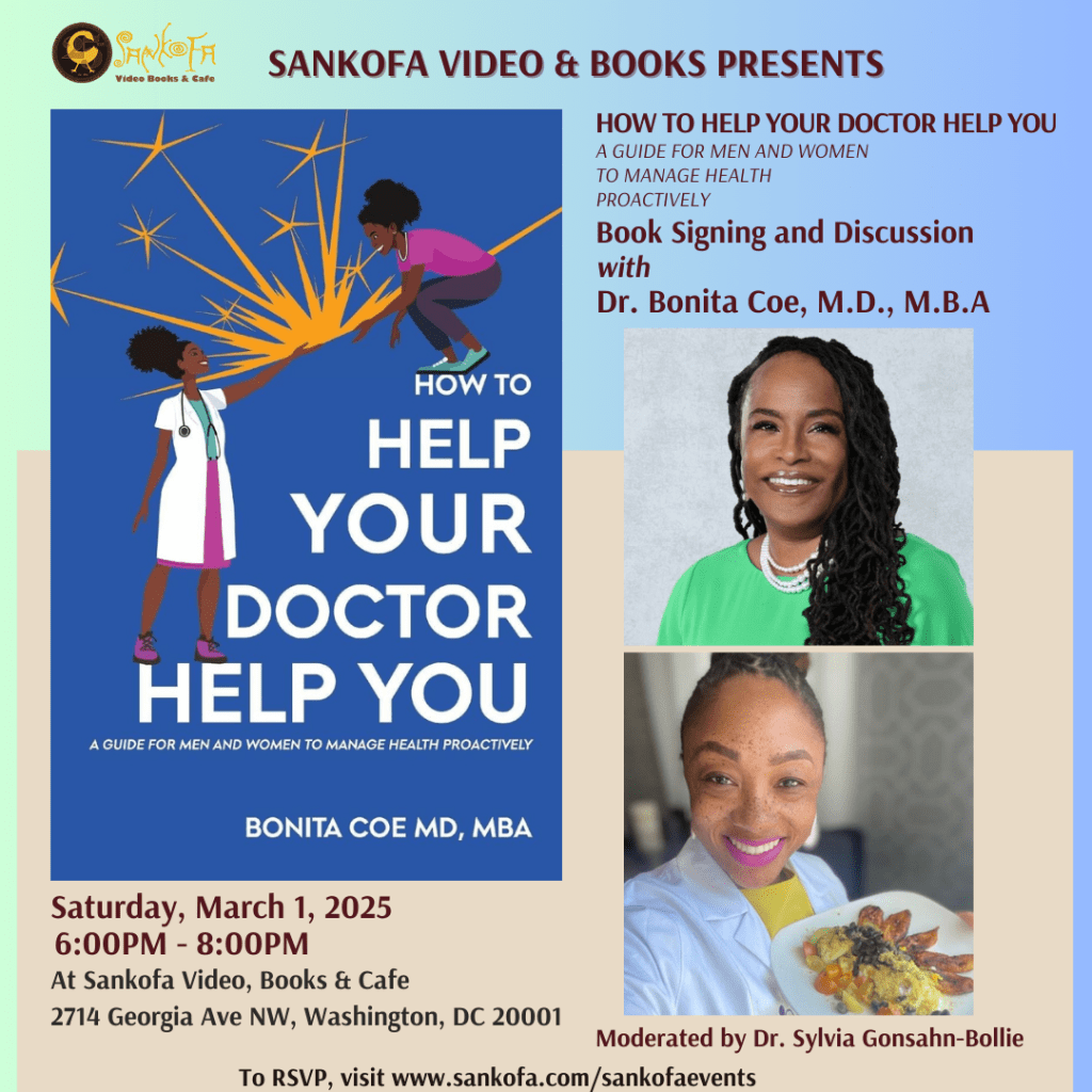 Book Talks, Book Talks & Book Stores, Conversations, DC Black History Happens Now, Information, Knowledge, Lectures, Talks & Panels by DC Black HistoryMarch 1, 20251:53 pmMarch 1, 2025 HOW TO help your doctor help you | 1mar@6-8pm SANKOFA VIDEO & BOOKS | 2714 Georgia Ave NW Washington DC 20001 Related